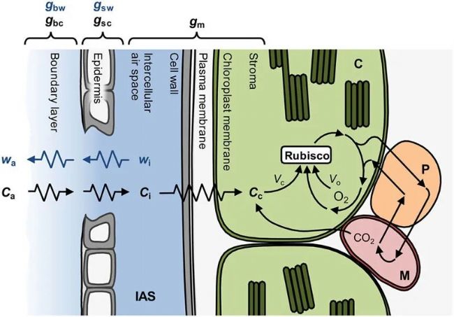 圖2. 葉片內(nèi)H2O和CO2擴散示意圖。如果已知邊界層對H2O擴散的導(dǎo)度(gbw),那么通過氣孔排出葉片飽和細胞間氣體空間(IAS)(wi)中的水蒸氣可用于通過測量大氣中的水蒸氣濃度(wa)來量化氣孔對H2O擴散的導(dǎo)度(gsw)。在氣體交換測量過程中,使用高速風(fēng)扇的氣體交換室會將邊界層降至最低,因此可以使用經(jīng)驗值對其進行合理的計算。由此,我們可以描述CO2反向擴散到IAS的路徑,還需要額外的信息來描述向葉綠體(C)擴散的路徑。通過邊界層(gbc)、氣孔(gsc)和葉肉(gm)進行CO2擴散的有限傳導(dǎo)可被視為擴散阻力,它導(dǎo)致大氣中的CO2濃度(Ca)逐漸下降到細胞間隙中的CO2濃度(Ci)和葉綠體中的CO2濃度(Cc)。Cc和葉綠體中的氧氣濃度決定了Rubisco羧化(Vc)和加氧(Vo)的相對速率。在加氧反應(yīng)之后,光呼吸CO2從線粒體(M)中釋放出來,其中還涉及過氧物酶體(P)中的一些反應(yīng)。