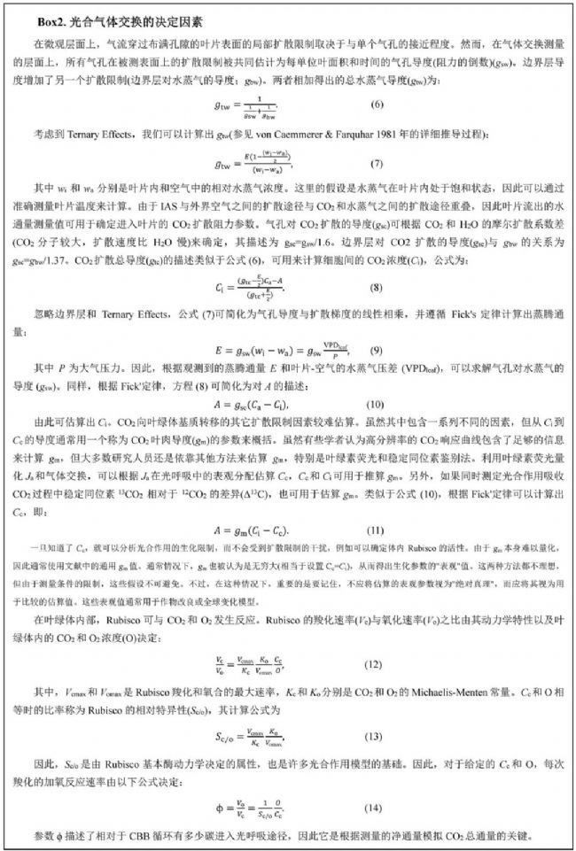 要分析光合作用的生化限制,首先需要確定CO2轉(zhuǎn)移的擴散軌跡參數(shù)。在這方面,需要同時測量水蒸氣交換。與進入葉片的CO2凈轉(zhuǎn)移類似,葉片外的水分轉(zhuǎn)移也是由擴散決定的。從水蒸氣可被假定為飽和(或在中低VPD條件下接近飽和)的IAS開始,水蒸氣沿著蒸汽壓力梯度向葉片周圍較干燥的空氣擴散。在大多數(shù)情況下,蒸騰作用造成的水分損失主要與通過氣孔的擴散轉(zhuǎn)移有關(guān),不過觀測到的水分釋放率也可能包括通過角質(zhì)層從葉片中流出的水分(見Box2)。