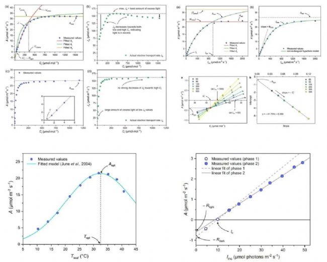 一組參數(shù)描述了特定環(huán)境條件下凈CO2或H2O交換的最大速率。例如,Amax描述的是當(dāng)光照和[CO2]達到飽和,Rubisco 加氧受到很大抑制時的最大CO2同化速率。Asat是環(huán)境CO2濃度和光飽和條件下的凈CO2同化率,因此是自然環(huán)境光照波動條件下可達到的最大同化能力的良好指標(biāo)。在一定溫度范圍內(nèi)的最大CO2凈同化率稱為 Aopt。該參數(shù)有助于從功能上描述凈光合作用對溫度的響應(yīng)。