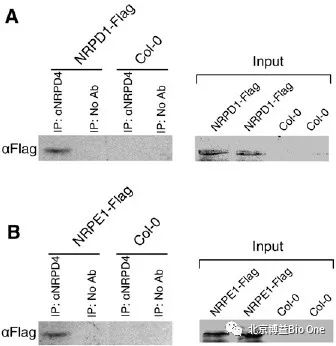 由于NRPD4/NRPE4和PRB4之間的高度相似,以及我們發(fā)現(xiàn)NRPD4/NRPE4在RdDM通路中的功能,我們想知道NRPD4是否可能是POl IV和/或Pol V的一個(gè)功能亞基,我們進(jìn)行了免疫共沉淀實(shí)驗(yàn)來(lái)檢測(cè)NRPD4/NRPE4與POl IV或Pol V的最大亞基的關(guān)聯(lián)。從NRPD1-Flag轉(zhuǎn)基因植株、NPRE1-Flag轉(zhuǎn)基因植株或未轉(zhuǎn)基因的野生型植株中提取蛋白質(zhì)與抗NRPD4/NRPE4抗體孵育,然后用蛋白A瓊脂糖珠沉淀。將結(jié)合蛋白復(fù)合物洗滌后洗脫,用抗Flag抗體進(jìn)行Western blot分析,檢測(cè)NRPD1a/NRPD1或NRPD1b/NRPE1是否與NRPD4/NRPE4免疫共沉淀。分析顯示NRPD1-Flag(圖8A)和NRPE1-Flag(圖8B)都可以被NRPD4/NRPE4抗體共沉淀。結(jié)果表明,NRPD4/NRPE4在體內(nèi)可以與NRPD1和NRPE1相互作用。因此,NRPD4/NRPE4可能在POl IV和Pol V中作為亞基起作用。