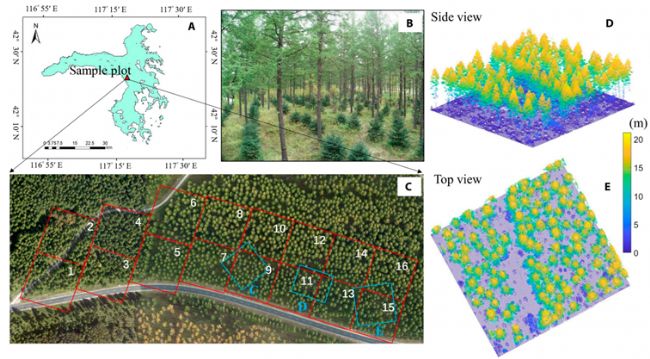 圖1 研究區(qū)域的分布,ALS點(diǎn)云,以及本研究中使用的參考數(shù)據(jù)的大致位置。(A)樣本地塊的位置。(B)無(wú)人機(jī)獲取圖像內(nèi)林下樹苗的實(shí)際場(chǎng)景。(C)樣地正射影圖,樣地分為15個(gè)子樣地,大小相同,用紅色方塊表示。疊加在紅色方塊上的藍(lán)色多邊形表示TLS數(shù)據(jù)收集的范圍。(D)研究區(qū)ALS點(diǎn)云側(cè)視圖,(E)俯視圖,包括成熟喬木和林下樹苗。