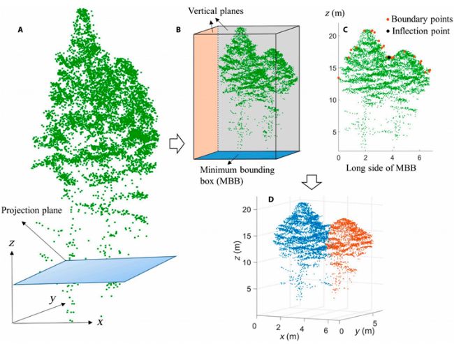 圖2 過分割和欠分割樹的后處理策略。(A) Undersegmented tree和投影平面。(B)使用最小邊界框算法構(gòu)造垂直平面。(C)拐點(diǎn)檢測(cè)。(D)樹的后處理結(jié)果。