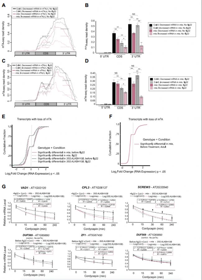 研究結(jié)果表明,m6A修飾在植物免疫反應(yīng)中起到了穩(wěn)定轉(zhuǎn)錄本和調(diào)節(jié)轉(zhuǎn)錄組的作用。m6A缺陷植物在模擬和真實(shí)的病原體感染前和感染期間表現(xiàn)出增強(qiáng)的抗性。此外,m6A修飾動(dòng)態(tài)變化與轉(zhuǎn)錄本的豐度和剪切變化相關(guān)聯(lián)。