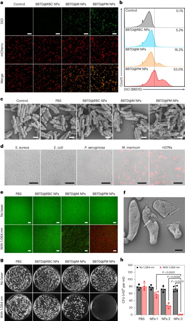 首先,通過(guò)體外實(shí)驗(yàn),發(fā)現(xiàn)BBTD@PM NPs能夠特異性地結(jié)合結(jié)核分枝桿菌,而對(duì)其他細(xì)菌沒(méi)有結(jié)合能力(圖4d)。然后,通過(guò)活/死細(xì)菌活力測(cè)定,證實(shí)了BBTD@PM NPs在1064 nm激光照射下對(duì)結(jié)核分枝桿菌具有光熱殺菌作用(圖4e)。研究發(fā)現(xiàn),BBTD@PM NPs與1064 nm激光聯(lián)合使用能大規(guī)模破壞結(jié)核分枝桿菌,導(dǎo)致細(xì)菌廣泛解體和破裂(圖4f-h)。這一結(jié)果表明,該靶向光熱殺菌策略導(dǎo)致耐藥的可能性極低。