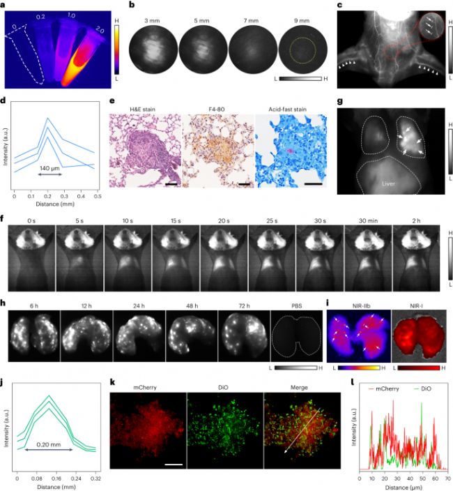 對(duì)BBTD@PM NPs的體內(nèi)NIR-IIb成像潛力進(jìn)行評(píng)估。研究發(fā)現(xiàn),BBTD@PM NPs在1064 nm照射下呈現(xiàn)出濃度依賴性的熒光發(fā)射(圖5a),并具有良好的組織穿透能力,最大組織穿透深度為9 mm(圖5b)。在體內(nèi)成像實(shí)驗(yàn)中,BBTD@PM NPs能夠快速到達(dá)感染部位,選擇性地積聚在肉芽腫中(圖5f),并具有精確的靶向和長(zhǎng)期跟蹤能力。與對(duì)照NPs相比,BBTD@PM NPs能夠清晰地識(shí)別直徑約0.2 mm的非常小的肉芽腫(圖5i,j)。這種成像策略提供了比常規(guī)NIR-I成像高得多的分辨率,能夠清晰識(shí)別肺組織中的肉芽腫。此外,DiO標(biāo)記的BBTD@PM NPs成功進(jìn)入肉芽腫的中心壞死部位,并與其中的mCherry標(biāo)記的H37Ra桿菌結(jié)合(圖5k,l),表明其具有雙重靶向能力。