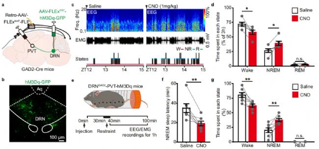 圖3:DRN-GAD2神經(jīng)元-PVT環(huán)路具有抑制覺醒的作用