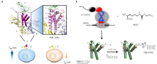 在這篇研究中,協(xié)和醫(yī)院張烜教授及合作團(tuán)隊(duì)通過無銅點(diǎn)擊反應(yīng)在指定位點(diǎn)摻入含疊氮化物的氨基酸,將細(xì)胞因子與聚乙二醇(PEG)部分正交結(jié)合而得到藥代動(dòng)力學(xué)和半衰期都大大提高的IL-2(如上圖所示),尤其是在Tyr31和Thr51位點(diǎn)均被20 kDa PEG化的IL-2優(yōu)先結(jié)合IL-2α亞基而不是β亞基,從而持續(xù)活化Treg細(xì)胞同時(shí)對CD8+ T細(xì)胞的活化程度低。