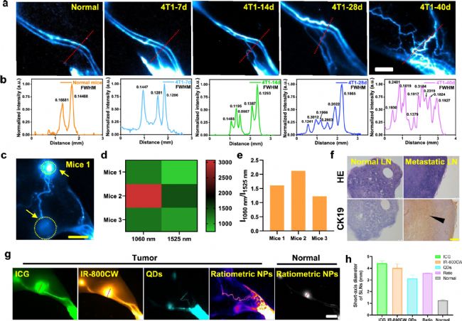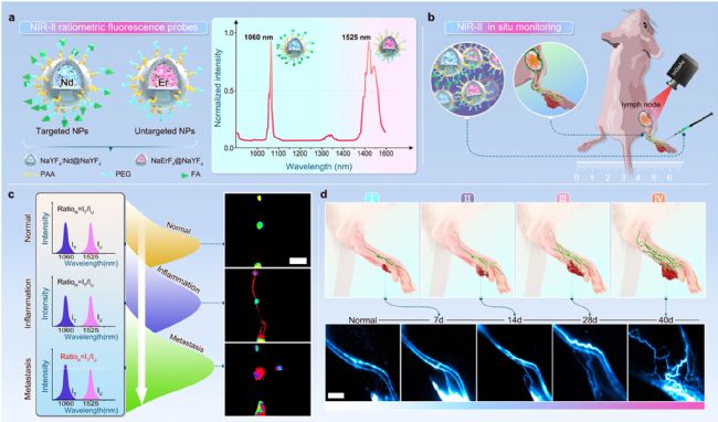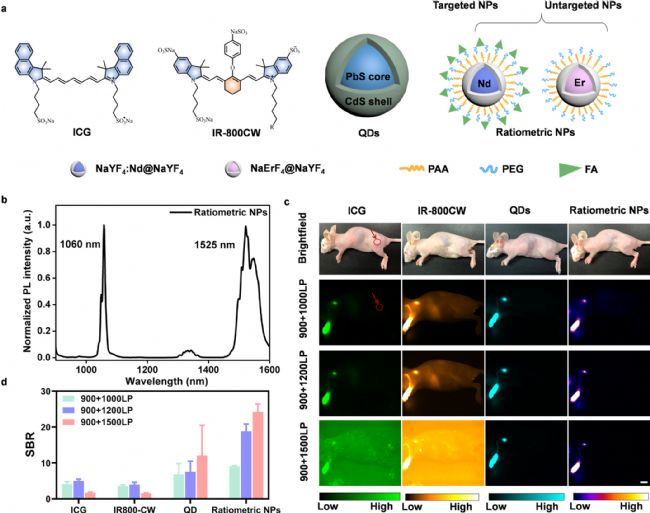 在作者以往的工作中報道了一對比率納米顆粒NaYF4:Nd@NaYF4(腫瘤靶向性)和NaErF4@NaYF4(無靶向性),分別在1060 nm處和1525 nm處顯示出強烈的發(fā)射,在1500 nm處具有最高的信背比(SBR),顯著地優(yōu)于目前臨床應(yīng)用的ICG和IR-800CW,并領(lǐng)先于作者先前研發(fā)的PbS@CdS量子點。在小鼠足部注射后可以精確可視化病變淋巴結(jié)(LN)的形態(tài)學變化,并準確地繪制LN與周圍組織之間的邊界。
