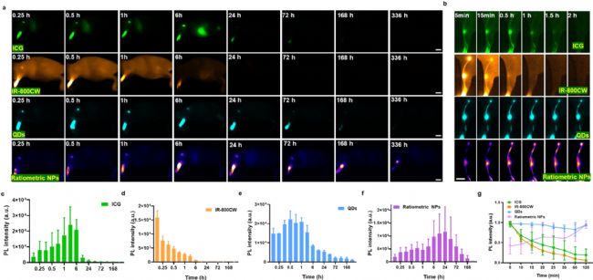 而要實現(xiàn)對SLN的持續(xù)監(jiān)測,還要求探針必須具有長期的LN保留以及良好的穩(wěn)定性。作者在正常小鼠中對4種熒光分子分別進行累積行為和光穩(wěn)定性測試,發(fā)現(xiàn)量子點和比例探針都表現(xiàn)出長期的LN保留,成像窗口可達約168小時;比例探針不僅在連續(xù)激發(fā)下表現(xiàn)出顯著的穩(wěn)定性,而且消除了區(qū)域熒光信號減弱引起的背景干擾?梢娫摫嚷侍结樋梢蕴峁┳銐虻臅r間窗口來收集有用的信息并完成手術(shù)程序。