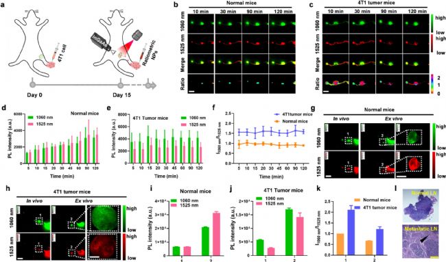 腫瘤附近的淋巴結(jié)可分為正常、炎癥和轉(zhuǎn)移期3種。目前依賴于SLN大小區(qū)分的成像探針靈敏度較低,因為轉(zhuǎn)移性和炎癥性SLN形態(tài)變化差異較小。而利用比率探針,通過在小鼠足墊注射4T1細胞建立后肢腫瘤模型,記錄1000-1100nm和1500 nm窗口內(nèi)的熒光信號并計算熒光比,可以分辨SLN中是否存在轉(zhuǎn)移性腫瘤。作者觀察到,荷瘤小鼠中來自NaYF4:Nd@NaYF4的信號明顯強于NaErF4@NaYF4的信號,而在正常小鼠中則沒有這種差異,與切除LN離體成像所得到的結(jié)果一致。