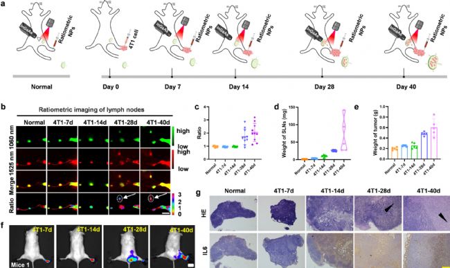 一般來說,腹股溝淋巴結(jié)與足部淋巴結(jié)通過淋巴管相連,即使不能呈現(xiàn)出比率型信號,也可被從腫瘤注射的探針照亮。但作者意外發(fā)現(xiàn),僅在腫瘤生長的第28天和第40天,比例探針才能照亮腹股溝淋巴結(jié)。這意味著早期腫瘤可能使小鼠淋巴管受損,但隨著腫瘤進展,淋巴管又重定向到腹股溝淋巴結(jié),從而導(dǎo)致腹股溝淋巴結(jié)也被腫瘤細胞浸潤。這一意想不到的發(fā)現(xiàn)進一步證明比率探針作為檢測平臺的足夠可靠性和靈敏度,具有現(xiàn)有探針無法實現(xiàn)的高對比淋巴管網(wǎng)絡(luò)成像能力和精確識別SLN轉(zhuǎn)移狀態(tài)的功能。