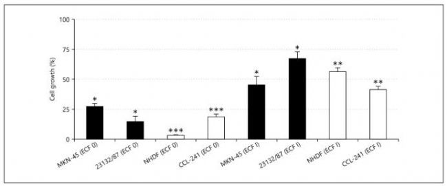 圖1:ECF對(duì)于胃癌細(xì)胞系(MKN-45和23132/87)與非惡性細(xì)胞系(NHDF和23132/87)的生長(zhǎng)抑制是劑量依賴型的,抑制效果不顯著