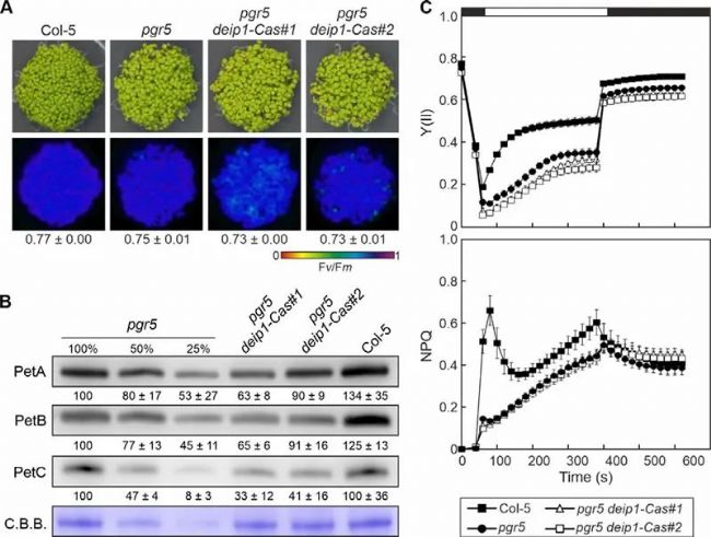 (A)在MS板上長時間培養(yǎng)4 d的WT (Col-5)、單(pgr5)和雙(pgr5 deip1- cas# 1和pgr5 deip1- cas# 2)突變體植株。下面是假彩色圖像,根據(jù)面板底部的色階顯示了每條植株線的Fv/Fm值。對于每條線,顯示值(n=3)±標(biāo)準(zhǔn)差(SD)的平均值。(B)從(A)中的幼苗中分離出等量的葉片總蛋白(調(diào)整為等于新鮮重量),在還原條件下通過SDS-PAGE分離,轉(zhuǎn)移到PVDF膜上,并用PetA-,PetB-或petc特異性抗體進行免疫修飾?捡R斯亮藍(c.b.b)染色作為上樣對照。給出了三個實驗的代表性印跡,以及波段定量(n=3)相對于pgr5(100%)±SD的平均值。(C)在100 μmol m−2 s−1的光化光作用下,使用HEXAGON-IMAGING-PAM熒光成像系統(tǒng)對(A)中暗適應(yīng)幼苗的誘導(dǎo)恢復(fù)曲線(如上圖白色和黑色條所示)的PSII量子產(chǎn)率(Y(II))和非光化學(xué)猝滅(NPQ)。顯示至少3次重復(fù)的平均值±SD。