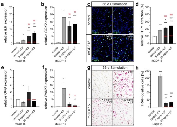 考慮到 ALP 活性對礦化至關(guān)重要,研究員進(jìn)一步分析了鈣沉積的形成,作為 rhGDF15 刺激 36 天時成骨細(xì)胞活性的標(biāo)志物(圖2 e、f)。結(jié)果觀察到,在 rhGDF15 的長期刺激下,礦化沉積物的形成略有增加,但似乎也與濃度無關(guān),然而,在成骨分化對照中這一增幅明顯更高。
