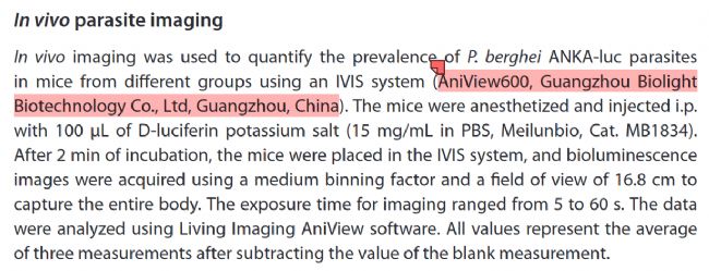研究中使用廣州博鷺騰生物科技有限公司AniView系列多模式活體成像系統(tǒng)拍攝了不同抑制劑組處理后小鼠伯氏瘧原蟲受感染程度變化,揭示了 PfPI3K調(diào)控通路中蛋白靶點(diǎn)。