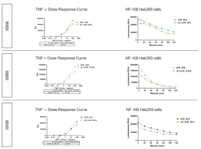 HEK293-NFK B-LUC細(xì)胞加入梯度稀釋的TNF 在37C、5%CO條件下刺激6小時(shí)后,分別用增強(qiáng)型、超敏型、穩(wěn)定型檢測(cè)試劑進(jìn)行信號(hào)檢測(cè)。