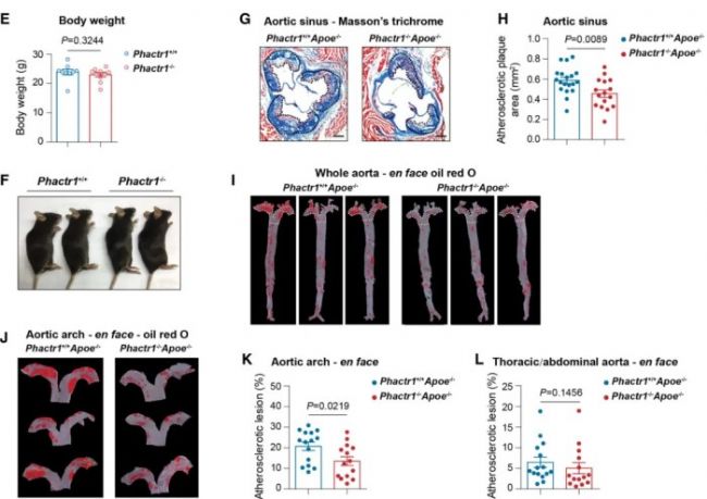 首先,實(shí)驗(yàn)建立了 PHACTR1 全身和條件敲除小鼠,為了確定 Phactr1 對(duì)動(dòng)脈粥樣硬化的影響,又雜交建立了 Phactr1−/−Apoe−/− 小鼠,并將實(shí)驗(yàn)組與對(duì)照組小鼠喂食 HF-HC 飲食誘導(dǎo)動(dòng)脈粥樣硬化。令人驚訝的是,敲除 Phactr1 顯著減輕了 Apoe−/− 小鼠的動(dòng)脈粥樣硬化(圖1 G、L),主動(dòng)脈竇、主動(dòng)脈弓內(nèi)粥樣硬化斑塊面積減少(圖1 G、H),但胸/腹主動(dòng)脈的動(dòng)脈粥樣硬化病變面積與對(duì)照組小鼠相似(圖1 I、L)。這表明,PHACTR1 是動(dòng)脈粥樣硬化發(fā)展所必需的。