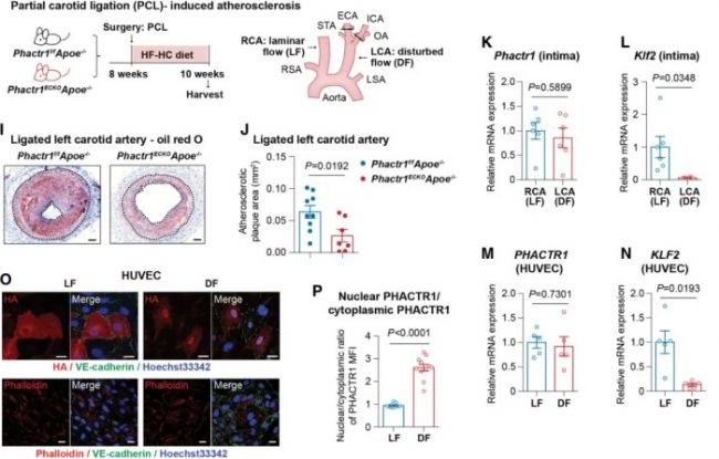為了具體研究?jī)?nèi)皮 PHACTR1 在動(dòng)脈粥樣硬化中的作用,建立了 EC特異性 Phactr1 KO(Phactr1ECKO),在與Apoe−/−小鼠雜交后,生成Phactr1ECKOApoe−/− 和Phactr1f/fApoe−/− 對(duì)照小鼠,并用 HF-HC 喂養(yǎng)。與上述結(jié)果一致,Phactr1ECKOApoe−/−小鼠主動(dòng)脈根部動(dòng)脈粥樣硬化斑塊面積減少。EC特異性 Phactr1 KO 可顯著減輕主動(dòng)脈弓區(qū)域的動(dòng)脈粥樣硬化,但對(duì)胸/腹主動(dòng)脈沒有作用。主動(dòng)脈弓區(qū)域的血流紊亂促進(jìn)了動(dòng)脈粥樣硬化斑塊的形成,研究結(jié)果表明,內(nèi)皮細(xì)胞 PHACTR1 可能介導(dǎo)了這一過程。然后對(duì)部分頸動(dòng)脈進(jìn)行結(jié)扎,觸發(fā) LCA 的振蕩流,結(jié)果表明,EC特異性 Phactr1 KO 可顯著減弱 DF 相關(guān)的動(dòng)脈粥樣硬化斑塊形成。這證明,內(nèi)皮細(xì)胞 PHACTR1 可以調(diào)控 DF 誘導(dǎo)的動(dòng)脈粥樣硬化。