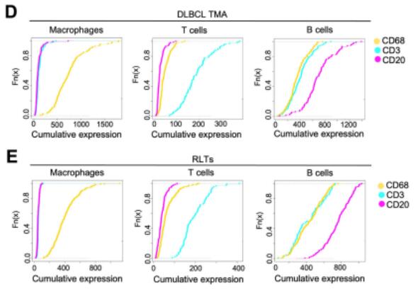 彌漫性大B細胞淋巴瘤(DLBCL)是成人非霍奇金淋巴瘤中最常見的類型。盡管R-CHOP治療對其有潛在療效,但約30%-40%的病例在初次治療后會復發(fā),因此了解其復發(fā)機制至關(guān)重要。為此,本研究采用數(shù)字空間圖譜(DSP)技術(shù),對DLBCL和反應性淋巴組織(RLT)中的相關(guān)巨噬細胞(TAMs)進行檢測,分析了CD68標記的巨噬細胞的轉(zhuǎn)錄組圖譜,從而揭示了這些細胞的空間特征,并探索了它們與DLBCL臨床/生物學特征的關(guān)系。