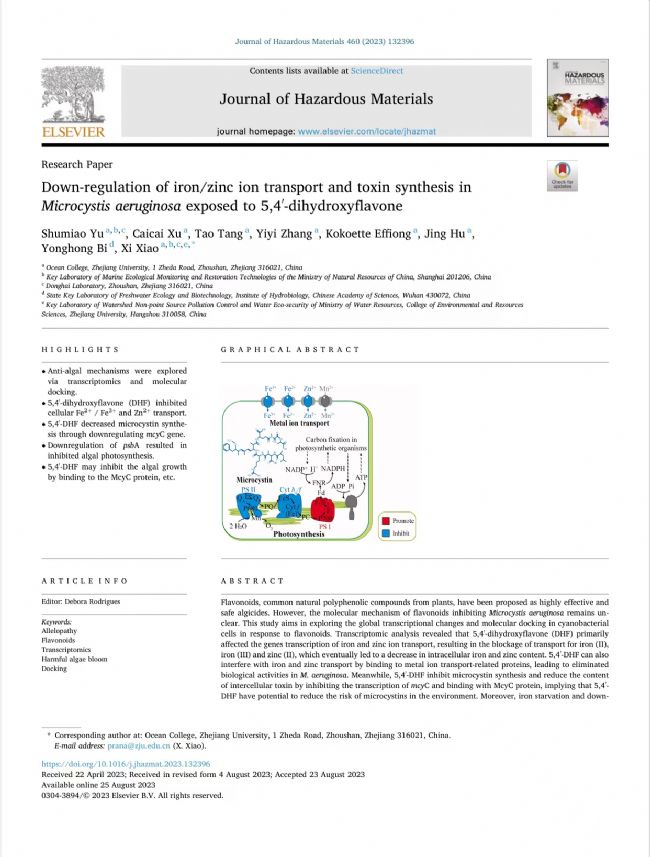 鐵/鋅離子轉(zhuǎn)運(yùn)和毒素合成的下調(diào)暴露于5,4′-二羥基ffavone的銅綠微囊藻