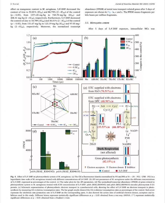 黃酮類化合物是植物中常見的天然多酚類化合物,被認(rèn)為是高效和安全的殺藻劑。然而ffavonoids抑制銅綠微囊藻的分子機(jī)制尚不清楚。本研究旨在探索藍(lán)藻的全球轉(zhuǎn)錄變化和分子對接細(xì)胞對ffavonoid的反應(yīng)。轉(zhuǎn)錄組學(xué)分析顯示,5,4′-二羥基法馮(DHF)主要是通過影響鐵和鋅離子轉(zhuǎn)運(yùn)的基因轉(zhuǎn)錄,導(dǎo)致鐵(II)轉(zhuǎn)運(yùn)受阻,最終導(dǎo)致細(xì)胞內(nèi)鐵和鋅含量的降低。5,4′-DHF也可以通過與金屬離子轉(zhuǎn)運(yùn)相關(guān)蛋白結(jié)合干擾鐵和鋅的轉(zhuǎn)運(yùn),導(dǎo)致消除銅綠假單胞菌的生物學(xué)活性。同時(shí),5,4′-DHF抑制微囊藻毒素的合成并降低其含量通過抑制mcyC的轉(zhuǎn)錄并與mcyC蛋白結(jié)合來抑制細(xì)胞間毒素,這意味著5,4′-DHF有可能降低環(huán)境中微囊藻毒素的風(fēng)險(xiǎn)。此外,鐵饑餓和光合作用相關(guān)基因轉(zhuǎn)錄的調(diào)控導(dǎo)致光合作用中電子傳輸?shù)囊种葡到y(tǒng)這些結(jié)果為ffavonoids的抑制機(jī)制提供了更多信息