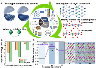 圖 2. a. 多尺度觀察 NCM523 材料直接再生機(jī)制的示意圖;b. NCM523 結(jié)構(gòu)塊體、表面鋁離子分別替換鎳離子、鈷離子、錳離子的形成能對(duì)比;c. 鋁摻雜和未摻雜的 NCM523 的鎳從 TM 層到鋰層的擴(kuò)散勢(shì)壘。