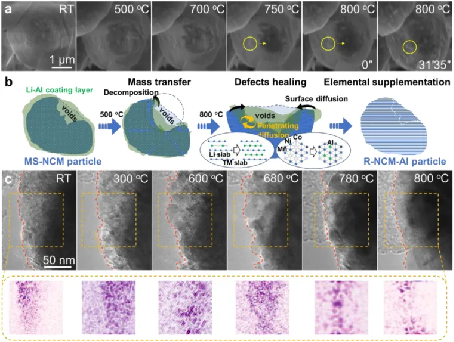 圖 6. a. 不同溫度下的原位 SEM 圖像展示了 MS-NCM 顆粒表面孔洞的熱愈合過程;b. MS-NCM 顆粒表面缺陷愈合的示意圖;c. 不同溫度下的原位 HRTEM 圖像展示了 MS-NCM 顆粒內(nèi)的裂縫熱愈合過程。