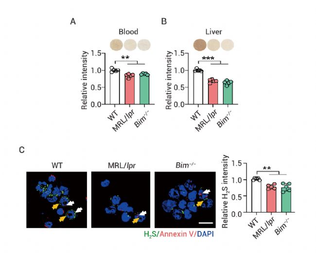 研究團(tuán)隊(duì)在此基礎(chǔ)上,檢測(cè)其 H2S 水平,發(fā)現(xiàn)細(xì)胞凋亡缺陷的 MRL/lpr 和 Bim−/− 小鼠中的 H2S 水平顯著降低。主要表現(xiàn)為:與野生型 (WT) 組相比,MRL/lpr 和 Bim−/− 小鼠的血液及肝臟、肺、脾和腎中的 H2S 水平顯著降低 (圖 2 A-B)。與 WT 小鼠相比,來(lái)自 MRL/lpr 和 Bim−/− 小鼠的 PBMC 顯示出細(xì)胞凋亡率降低和 H2S 水平降低 (圖 2C)。