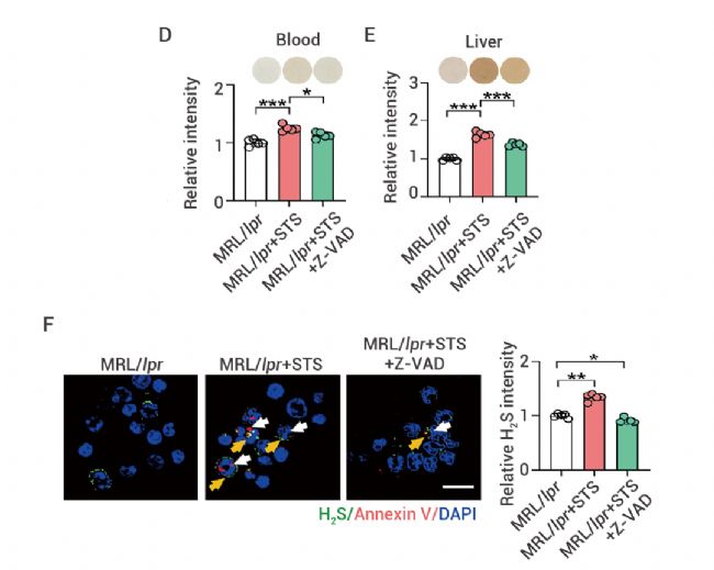 (A) 醋酸鉛形成試驗(yàn)顯示雌性 MRL/lpr 和 Bim−/− 小鼠血液 H2S 濃度降低; (B) 醋酸鉛形成實(shí)驗(yàn)顯示,凋亡缺陷小鼠肝中 H2S 濃度低于 WT 小鼠 (肺、脾、腎未顯示); (C) 來(lái)自雌性 MRL/lpr 和 Bim−/− 小鼠的 PBMC 顯示凋亡細(xì)胞和 H2S 水平降低。黃色箭頭表示 H2S,白色箭頭表示凋亡細(xì)胞; (D) STS 處理提高了 MRL/lpr 小鼠的血液 H2S 濃度,而 Z-VAD 處理降低了 H2 濃度; (E) STS 治療增加了MRL/lpr 小鼠肝臟中的 H2S 濃度 (肺、脾、腎未顯示),而 Z-VAD 治療則抑制了該濃度; (F) STS 處理促進(jìn) MRL/lpr 小鼠 PBMC 中的細(xì)胞凋亡和 H2S 生成,Z-VAD可減輕這種情況。黃色箭頭表示 H2S,白色箭頭表示凋亡細(xì)胞。