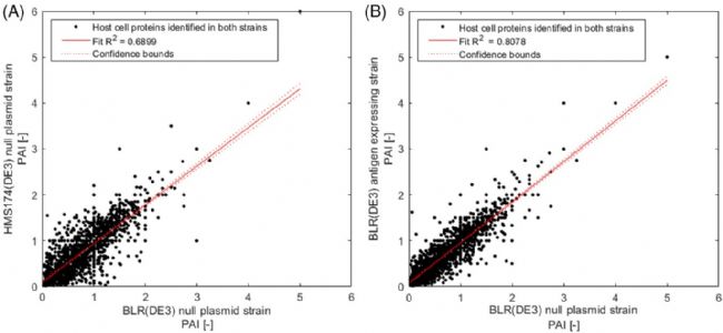 然后,作者比較了BLR和HMS174(空載質粒)菌株之間的蛋白質組學表達譜,約80%的蛋白在兩個菌株中均被檢測到,且其蛋白相對豐度(PAI)的線性回歸結果表明,即使在不同的大腸桿菌菌株之間,HCPs的總量也是相當?shù)模▓D2A)。此外,我們比較了BLR空載質粒菌與相應抗原表達菌株之間的蛋白表達,發(fā)現(xiàn)約90%的蛋白在兩個樣品中是相同的,但豐度存在少許差異(圖2B),可能是與制備過程的細微差異有關,因為抗原表達菌株純化前會有一次凍融。另一個原因可能是抗原的表達會對檢測到的宿主細胞蛋白質產生一定的影響,但這種差異一般很小,因此空載質粒菌株的蛋白表達可以用于指導抗原表達菌株的純化工藝。