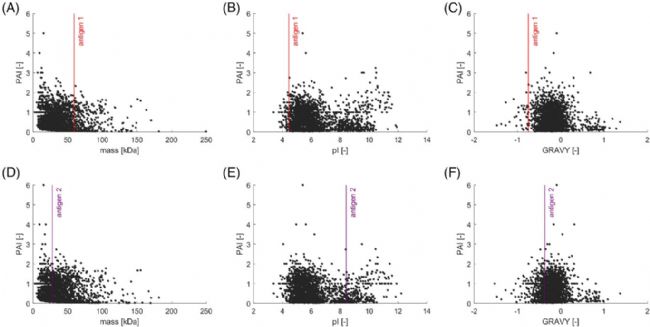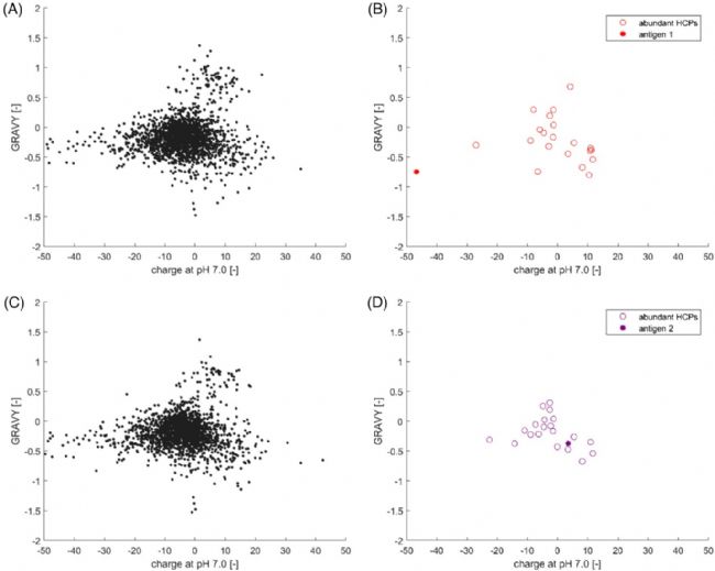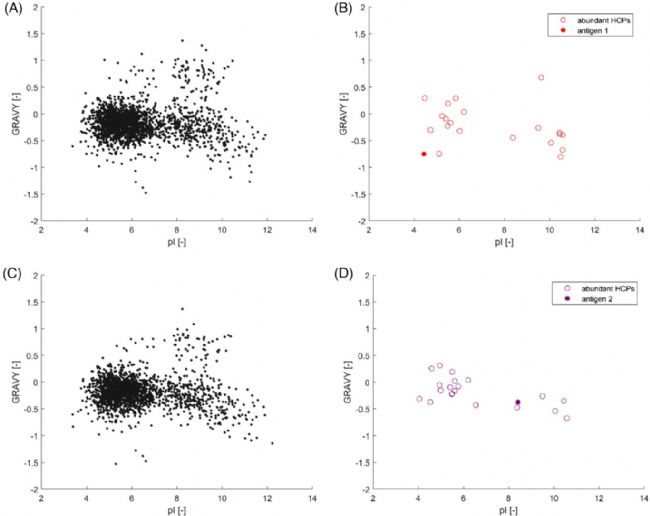 作者比較了空載質粒BLR與HMS174菌株中分別表達的“抗原1”和“抗原2”與HCPs的MW(分子量)、pI(等電點)、GRAVY(疏水性)等指標。在兩個菌株中,HCPs的分子量總體分布在2 - 250 kDa,大多數(shù)蛋白質的分子量< 50 kDa(圖3A和3D),豐度較高的蛋白質均分布在低分子量范圍內?乖1的分子量為59 kDa,而抗原2的分子量小一些,為28 kDa?梢猿醪嚼没诜肿哟笮〉姆蛛x機制,例如SEC,將抗原從分子量相差較大的HCPs中分離出來。但是在剩下的高豐度HCPs的區(qū)域,通過質量差來分離目標抗原的效果可能就不是很理想了。