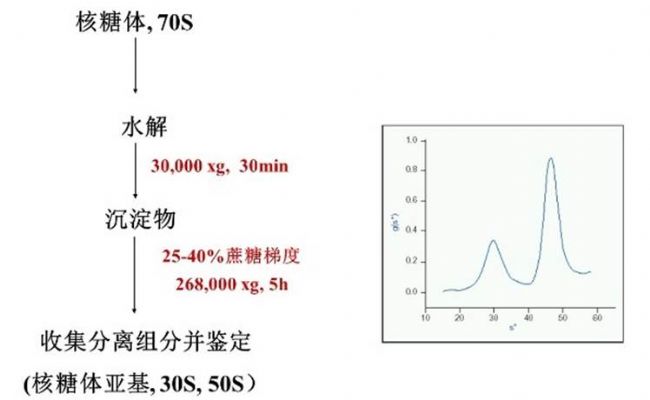 速率區(qū)帶離心經(jīng)典的應(yīng)用就是通過蔗糖密度梯度離心,進(jìn)行各種亞細(xì)胞器(核糖體、線粒體、Exosome 等)和病毒顆粒(病毒載體、疫苗等)的純化。例如,我們在上一期中得到的 70S 核糖體沉淀,經(jīng)過水解后,可利用蔗糖密度梯度離心,進(jìn)一步分離純化得到 50S 和 30S 的兩個亞基。具體的實驗流程如下: