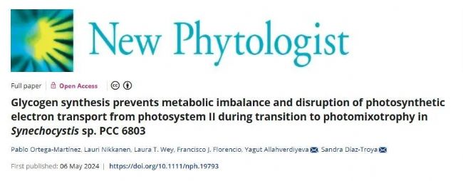 在自然界中,藍(lán)藻作為一類重要的光合自養(yǎng)微生物,在生態(tài)系統(tǒng)中扮演著關(guān)鍵角色。它們通過光合作用固定二氧化碳,對(duì)全球碳循環(huán)貢獻(xiàn)顯著。除了自養(yǎng)生長(zhǎng),某些藍(lán)藻如Synechocystis sp. PCC 6803還具有混合營(yíng)養(yǎng)的能力,即在光照條件下同時(shí)利用二氧化碳和有機(jī)碳源(如葡萄糖)生長(zhǎng)。這種營(yíng)養(yǎng)模式的轉(zhuǎn)換及其主要碳儲(chǔ)存大分子——糖原的作用尚不清楚。2024年5月6日,New Phytologist雜志在線發(fā)表芬蘭圖爾庫(kù)大學(xué)與西班牙塞維利亞大學(xué)聯(lián)合署名標(biāo)題為Glycogen synthesis prevents metabolic imbalance and disruption of photosynthetic electron transport from photosystem II during transition to photomixotrophy in Synechocystis sp. PCC 6803的研究論文。文章旨在探討糖原在光自養(yǎng)生長(zhǎng)向光混合營(yíng)養(yǎng)生長(zhǎng)轉(zhuǎn)換過程中的生理和代謝作用,以及糖原合成對(duì)光合作用電子傳遞鏈的影響。