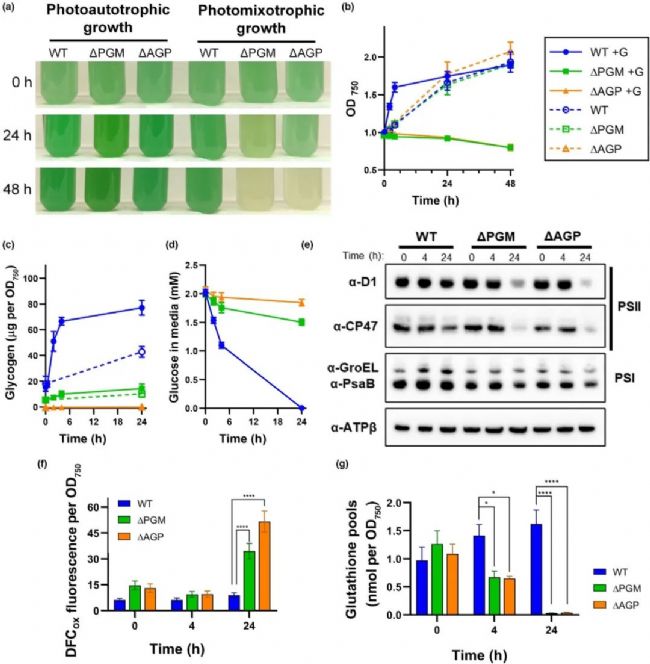 葡萄糖會(huì)導(dǎo)致糖原代謝受損菌株的生長(zhǎng)停滯、氧化應(yīng)激和 PSII 水平降低,圖中顯示了補(bǔ)充 2 mM葡萄糖后WT集胞藻和糖原代謝缺陷菌株的表型表征。