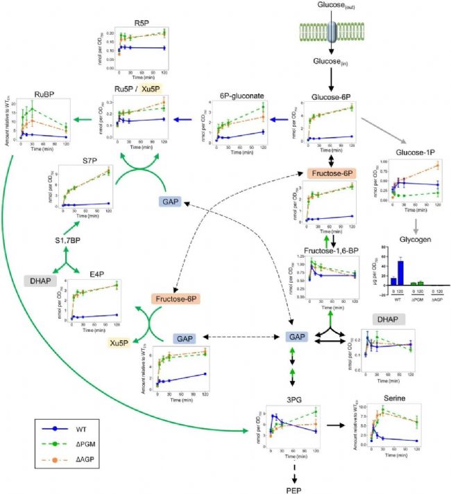 控制葡萄糖引起的直接代謝變化需要糖原代謝,圖中顯示了添加葡萄糖后 WT、ΔPGM 和 ΔAGP Synechocystis 菌株上游代謝的變化。