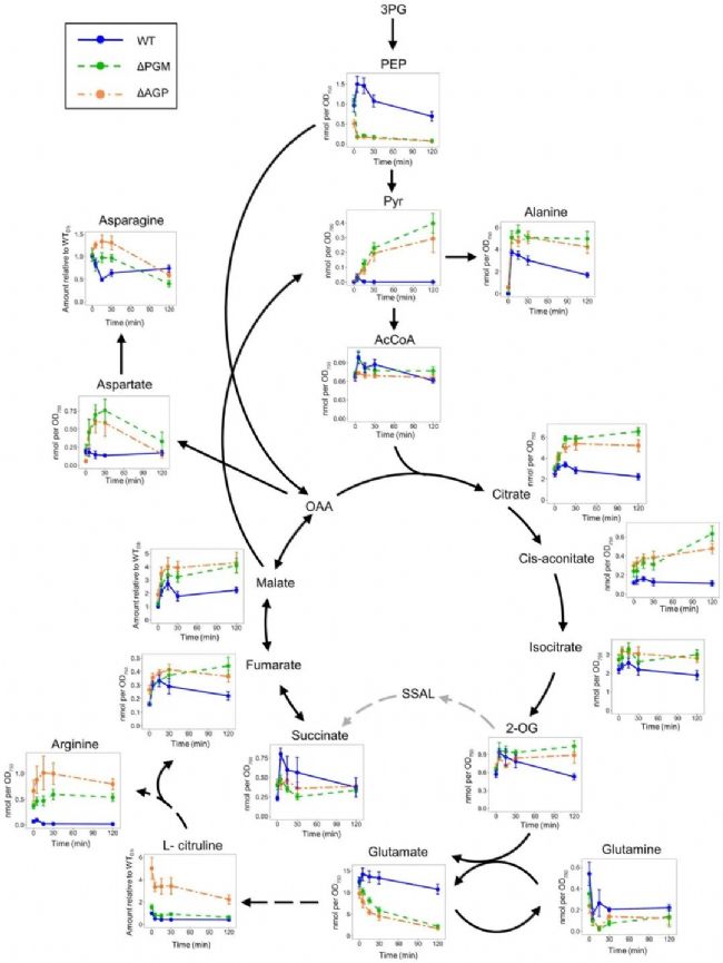 控制葡萄糖引起的直接代謝變化需要糖原代謝,圖中顯示了添加葡萄糖后 WT、ΔPGM 和 ΔAGP Synechocystis 菌株下游代謝的變化。