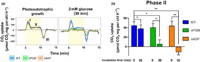 研究發(fā)現(xiàn)糖原起著代謝緩沖器的作用。在野生型(WT)中,添加葡萄糖會(huì)增加生長(zhǎng)和糖原儲(chǔ)備,但在糖原合成突變體中,生長(zhǎng)會(huì)停止。添加葡萄糖30分鐘后,糖原合成突變體中卡爾文-本森-巴薩姆循環(huán)和氧化磷酸戊糖分流的代謝物比 WT增加了三倍。這些變化極大地影響了糖原合成突變體的光合作用性能,因?yàn)檠鯕膺M(jìn)化和二氧化碳吸收都受到了影響。
