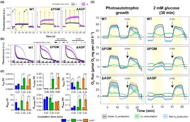 分析補(bǔ)充葡萄糖對(duì) WT、∆PGM 和 ∆AGP Synechocystis 菌株光合作用和PSII性能的影響。