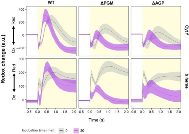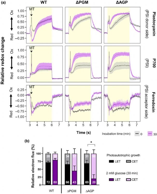 Synechocystis 光能自養(yǎng)時(shí)和添加葡萄糖30分鐘后PETC中PSI氧化還原特性和電子流。