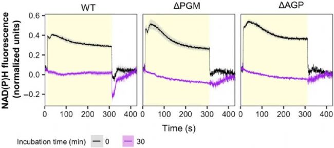 WT、∆PGM 和 ∆AGP Synechocystis 菌株在光自養(yǎng)和添加葡萄糖 30 分鐘后的 NAD(P)H 熒光。