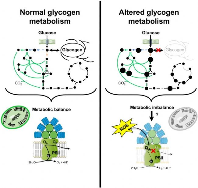 糖原在聚胞藻中對(duì)光混合營(yíng)養(yǎng)的代謝適應(yīng)中的作用及其與光合作用的相互聯(lián)系。在光異養(yǎng)生長(zhǎng)的細(xì)胞中,葡萄糖的攝取用于細(xì)胞代謝誘導(dǎo)代謝譜的變化,部分碳重新定位為糖原。這允許平穩(wěn)過渡到光混合營(yíng)養(yǎng)條件。然而,糖原代謝受損迫使葡萄糖攝取轉(zhuǎn)向中樞碳代謝,導(dǎo)致代謝在幾分鐘內(nèi)溢出。這種不平衡會(huì)影響PSII供體側(cè)的電子轉(zhuǎn)移。光合作用受阻的合理原因包括代謝類似物在PSII內(nèi)的碳酸氫鹽置換或誘導(dǎo)由PSII相關(guān)蛋白介導(dǎo)的次級(jí)調(diào)節(jié)機(jī)制。這種阻塞最終導(dǎo)致活性氧的產(chǎn)生增加,阻礙了生存能力。