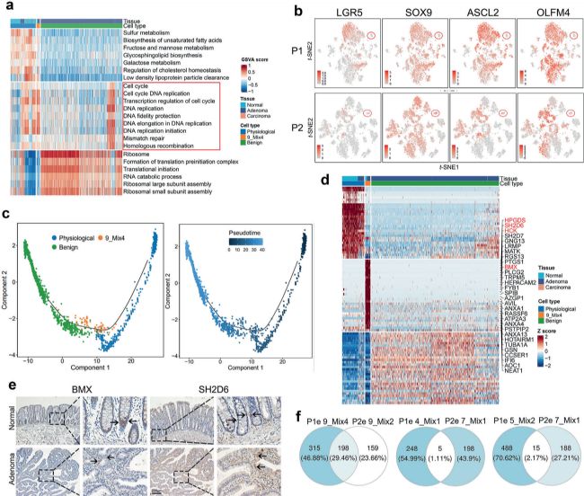 對(duì)DEGs的分析將這些混合群體與正常、良性和惡性的上皮細(xì)胞區(qū)分開(kāi)來(lái)(圖3c和補(bǔ)充圖6c)。然后,我們使用富集分析來(lái)描述具有異質(zhì)性組織來(lái)源的細(xì)胞群的轉(zhuǎn)錄組特征。正常腺瘤的混合群體(P1和P2的Cluster9)與生理和良性群體的其余群體相比表現(xiàn)出強(qiáng)烈的增殖特征(圖4a和補(bǔ)充圖9a)。它們也沒(méi)有干細(xì)胞性特征或基底細(xì)胞特征(圖4b),排除了正常干細(xì)胞的來(lái)源。因此,這兩個(gè)簇可能是正常和腺瘤細(xì)胞之間中間階段的腺瘤前體細(xì)胞群。前體細(xì)胞群位于從生理階段到良性階段的假時(shí)間軌跡路線圖的中間位置(圖4c和補(bǔ)充圖9b)。接下來(lái),我們確定了特定的標(biāo)記基因來(lái)定義腺瘤前體細(xì)胞群。DEGs分析顯示,這些群體中特異性上調(diào)的基因包括HPGDS、SH2D6、HCK和BMX(圖4d和補(bǔ)充圖9d)。然后,我們通過(guò)檢測(cè)在癌變過(guò)程中起關(guān)鍵作用的標(biāo)記蛋白BMX和SH2D6來(lái)評(píng)估活檢切片中前體群體的復(fù)發(fā)情況(圖4e)。20例患者中有9例和14例分別為腺瘤前體細(xì)胞群中BMX和SH2D6水平較高的細(xì)胞群(補(bǔ)充表3)。出乎意料的是,腺瘤前體細(xì)胞群P1和P2在deg中有約30%的重疊(圖4f).