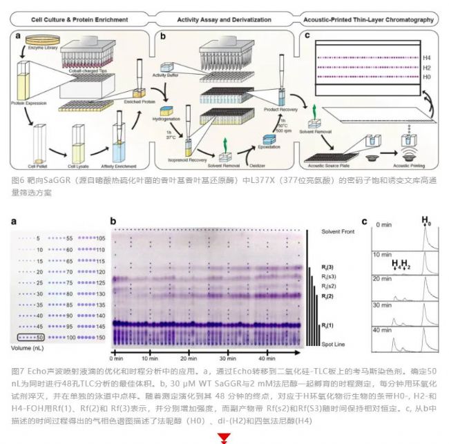 隨著合成生物學(xué)的發(fā)展,使得通過大腸桿菌或釀酒酵母等微生物用于篩選氫化烯烴的酶,成為克服石油精煉過程中烯烴加氫面臨的催化劑中毒、傳質(zhì)限制、發(fā)熱以及與氫氣、儲(chǔ)存和催化劑等相關(guān)的一個(gè)重要的解決方案。相比于LC/GC-MS復(fù)雜的工作流程和較長的分析時(shí)間,使用Echo聲波移液和薄層色譜搭建的自動(dòng)化96孔篩選平臺(tái)極大地提高了檢測(cè)速度,使并行多個(gè)樣品檢測(cè)即時(shí)可視化,讀值結(jié)果更可靠,成為一種高效的篩選流程,用于確定與工程化GGR蛋白文庫相關(guān)的酶活性和產(chǎn)物形成譜。使用Echo將環(huán)氧化反應(yīng)產(chǎn)物“打印”涂覆在薄層二氧化硅上,根據(jù)環(huán)氧化程度進(jìn)行色譜分離,并與發(fā)色團(tuán)共價(jià)連接,從而可以檢測(cè)具有獨(dú)特產(chǎn)物分布或增強(qiáng)還原酶活性的酶變體。經(jīng)過GC-MS驗(yàn)證,這種基于薄層色譜的篩選可以區(qū)分選定突變體酶活性的四倍差異。