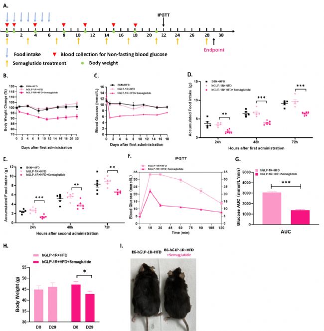 圖5 GLP-1R激動(dòng)劑Semaglutide顯著降低高脂飲食(HFD)條件下B6-hGLP-1R小鼠的血糖和體重