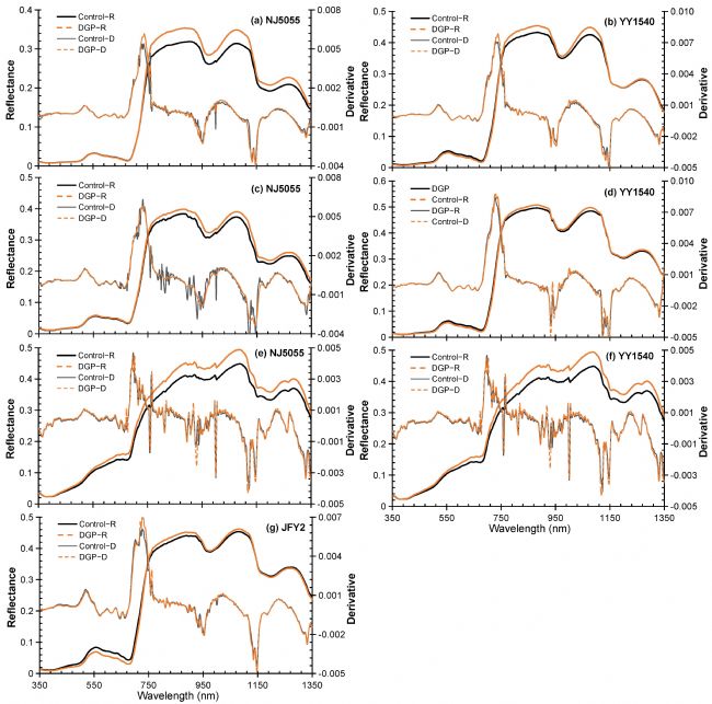 圖 2. 稻田浮萍 (DGP) 對水稻冠層光譜特征的影響。 Control-R,控制中的反射光譜數(shù)據(jù); DGP-R,稻田浮萍的反射光譜數(shù)據(jù); Control-D,對照中的導(dǎo)數(shù)光譜數(shù)據(jù); DGP-D,稻田中浮萍的導(dǎo)數(shù)光譜數(shù)據(jù)。 NJ5055和YY1540在預(yù)填充階段的光譜特性分別由(a)和(b)表示; NJ5055、YY1540、JFY2在充填中期的光譜特性分別用(c)、(d)、(g)表示。 NJ5055和YY1540成熟期的光譜特征分別用(e)和(f)表示。