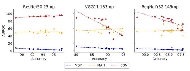 圖3三種OOD算法(MSP、MAH、EBM)的AUROC隨三種架構(gòu)(ResNet50、RegNetY32、VGG11)昆蟲分類器精度增量的變化趨勢。