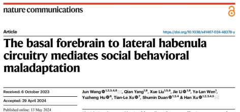 2024年5月13日浙江大學醫(yī)學院徐晗教授在Nature Communications雜志上發(fā)表文章揭示了基底前腦投射到外側(cè)韁核的興奮性環(huán)路調(diào)控社交恐懼行為。