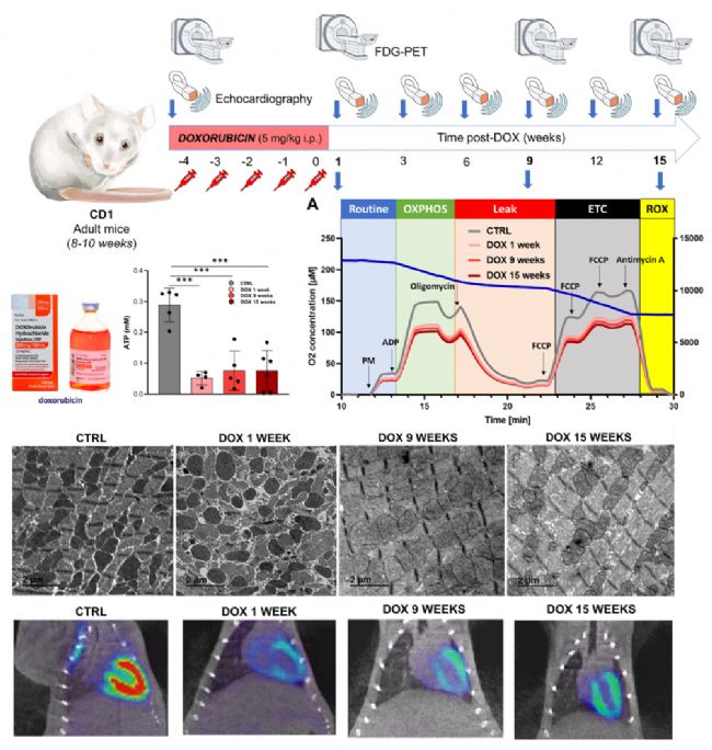 表征線粒體氧化磷酸化復合體I功能活性顯著性降低)。心臟組織的透射電子顯微鏡檢查顯示,阿霉素治療后1周,線粒體的大小和結構保持不變,在阿霉素治療后9周,線粒體腫脹,在阿霉素治療前15周,線粒體明顯碎裂,線粒體大小顯著減少。體內18F-FDG PET研究證實,在阿霉素治療完成后檢查的所有時間點,心臟葡萄糖攝取顯著減少。