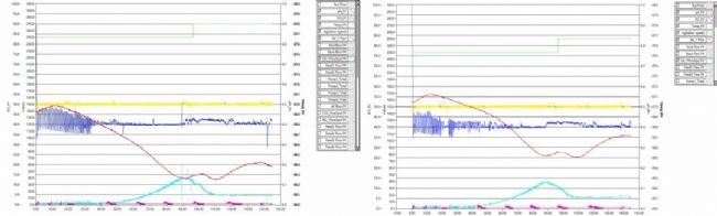 圖2 SF9細(xì)胞在R1(左)和R2(右)條件下培養(yǎng)周期參數(shù)控制趨勢(shì)圖:— “溫度(℃)”;— ”pH”;— “DO”;— “轉(zhuǎn)速(rpm)”;— “空氣流速(mL/min)”;— “氧氣流速(mL/min)”。