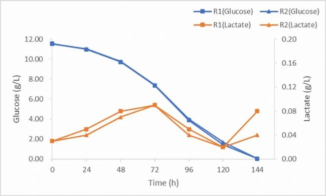 圖5 SF9細(xì)胞在R1和R2條件下葡萄糖消耗曲線和乳酸代謝曲線。